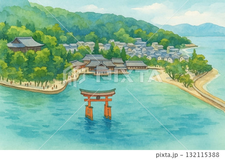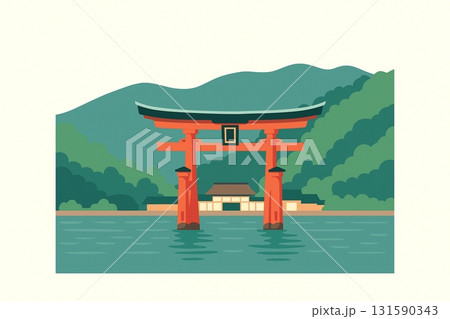 日本の宮島厳島神社の鳥居のイラスト 世界遺産、観光名所 白背景 ベクターデータ