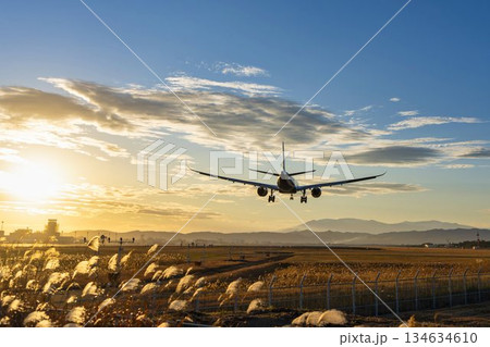 夕暮れの仙台空港 着陸中の飛行機 宮城県名取市
