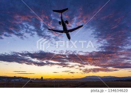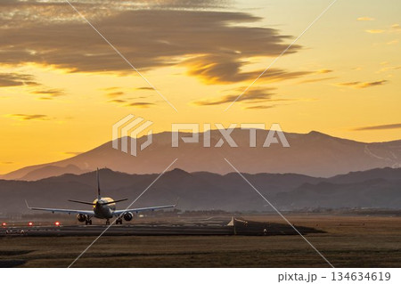 夕暮れの仙台空港 夕日と離陸中の飛行機 宮城県名取市