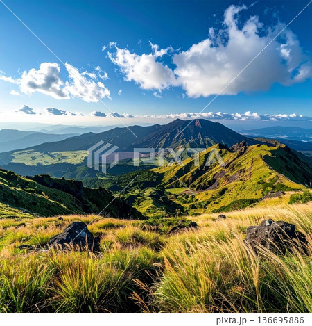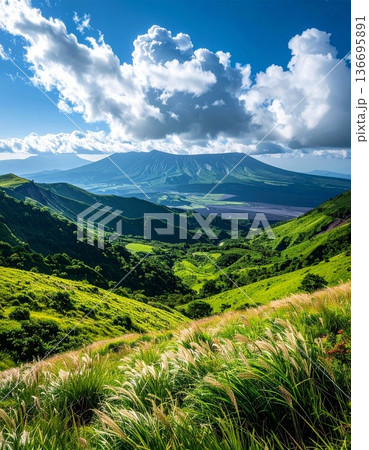 Panorama view of Aso volcano highland mountain landscape in Summer at in Kumamoto Prefecture, Kyushu, Japan.