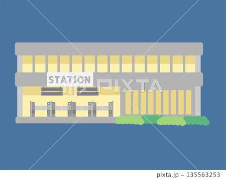 グレー基調で灯りがともる夜の大きな駅舎イラスト