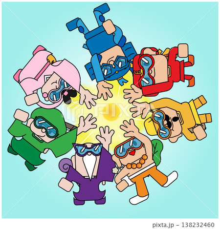 円陣を組む七福神のイラスト 団結と協力のポップな開運デザイン