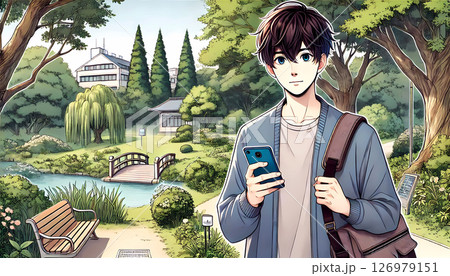 スマホを見ながら公園を歩く若い男性