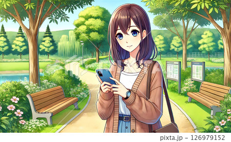 スマホを見ながら公園を歩く若い女性