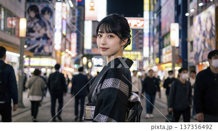 夜の秋葉原でネオンに照らされる黒い着物姿の日本人女性