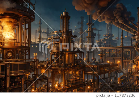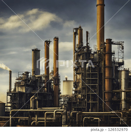真紅の空に浮かび上がるプラント工場の蒸留塔と配管の壮観な風景