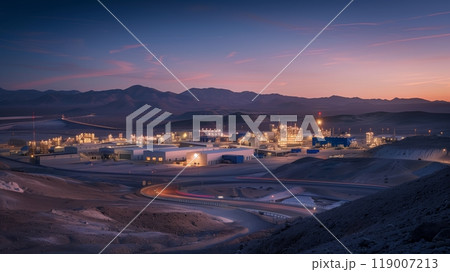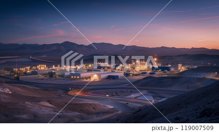 At twilight, a futuristic industrial park contrasts sharply with the surrounding vast desert landscape.