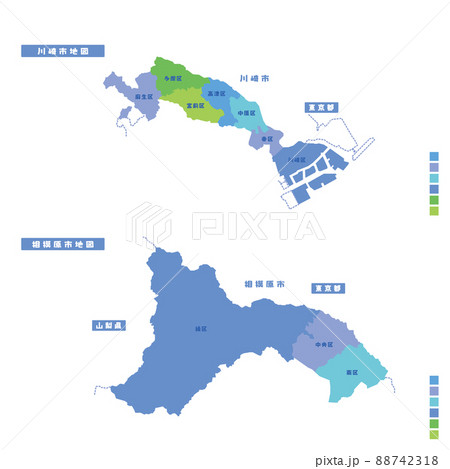 川崎市行政区・川崎市地図+相模原市行政区・相模原市地図 雨の日カラーで色分けしてみた