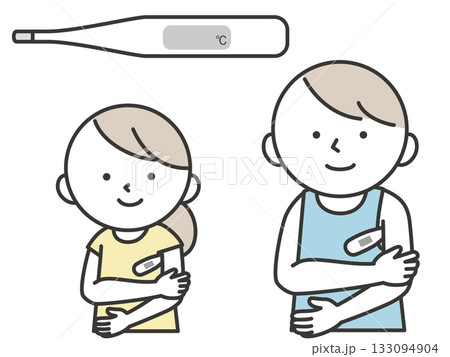 体温計をわきの下に挟んで体温計測をする子供のイラスト