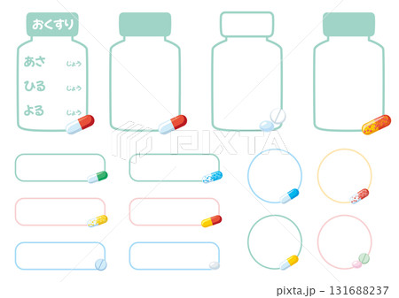 薬瓶型フレーム&お薬アイコン付きシンプルフレームセット/角丸・円形・ラベル・帯デザイン|A4比率