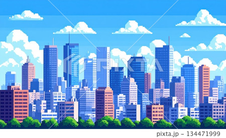 都市景観の背景。高層ビルが立ち並ぶ都会の街並み風景イラスト。オフィスビルと商業ビル。