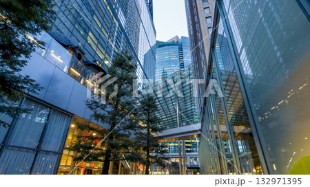 高層ビルを見上げるオフィス街の風景