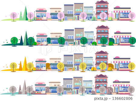 四季の街並みのバナーセット:春・夏・秋・冬の建物と街路樹のイラスト