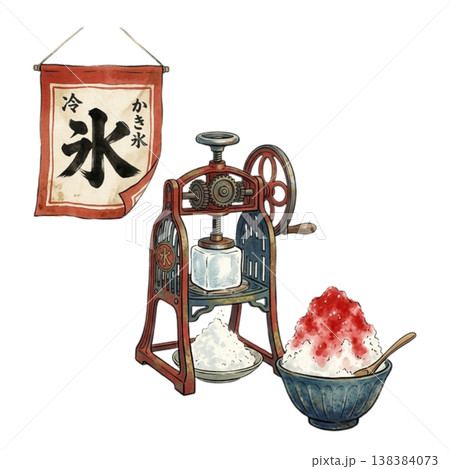 日本画風に描いた、かき氷とレトロなかき氷を削る機械