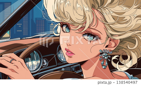 1980年代シティポップの雰囲気漂う女性と車のスタイリッシュなファッションイラスト、都会的で華やか