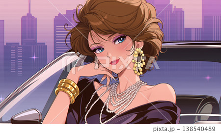 1980年代のシティポップをイメージした女性と車のファッションイラスト、都会的で洗練されたスタイル
