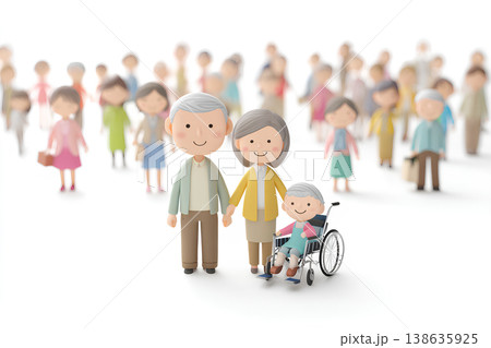 車椅子を押す家族と見守る人々の温かな日常風景