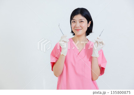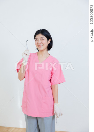 歯科用の器具を持って微笑むスクラブを着た女性
