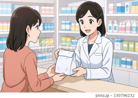 処方薬を案内する女性薬剤師 アニメ風イラスト 調剤薬局の仕事イメージ素材