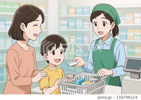 薬局のレジで会計をする母と子のイラスト