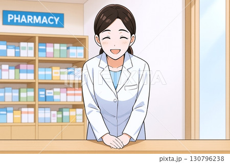 薬局で笑顔で対応する薬剤師のイラスト