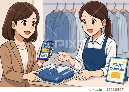 レジで笑顔で対応するアパレル店員と女性客の販売シーン