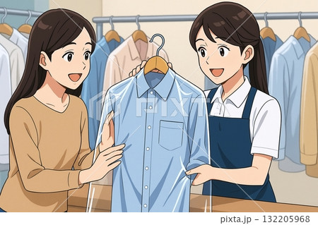 シャツを渡し笑顔で挨拶する店員と高齢女性