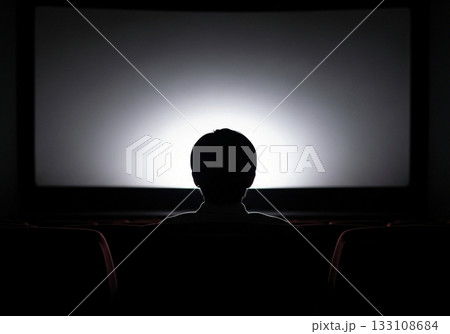 映画館で映画を一人で観ている笑顔の女性(両隣に客なし)