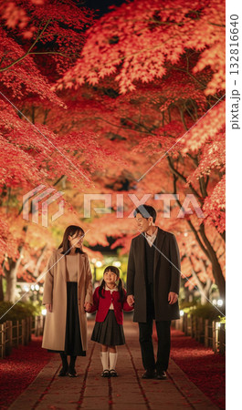 紅葉のライトアップを見にきた家族
