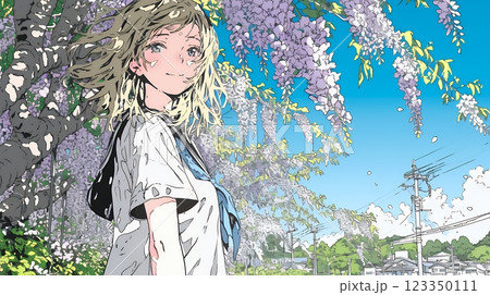 満開の藤の花の下を歩いている女子高生