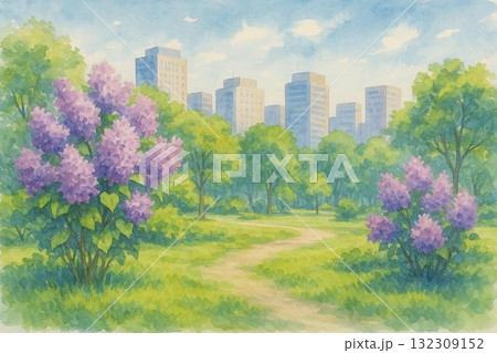 都市公園 ライラック 5月 水彩画
