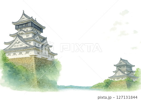 小倉城と夏の青空が調和した歴史と自然の和風フレーム(中央余白・透過PNG)