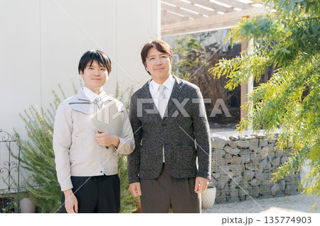 家の外で打ち合わせをする男性たち
