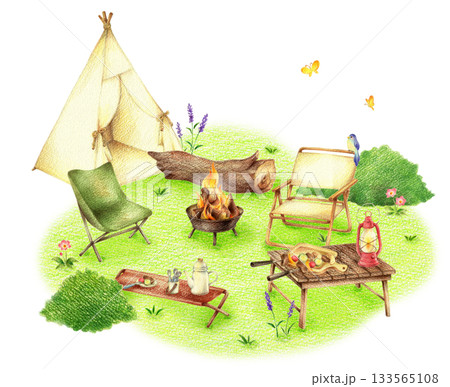 緑の野原のキャンプのバーベキュー 手描き色鉛筆画