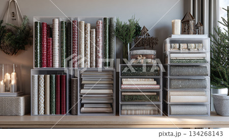木目調の家具で統一された整理整頓された明るいリビングルームのイラスト