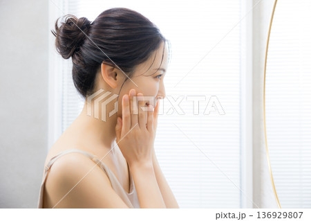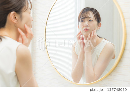 洗面所で肌の調子を確認する若い女性
