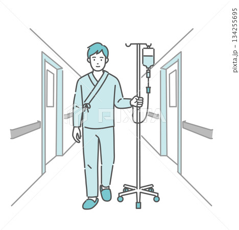 病院の廊下を点滴スタンドを押して歩く男性患者(入院生活)