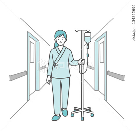 病院の廊下を点滴スタンドを押して歩く女性患者(入院生活)