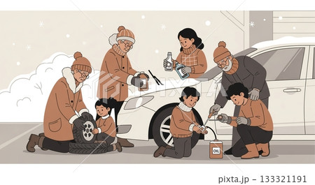 切り絵風。車庫の前で整備士と会話する日本の家族と自動車
