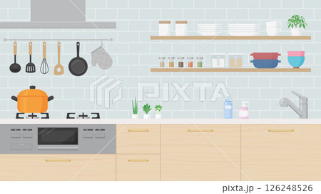 おしゃれなキッチンの背景イラスト_明るい_16:9