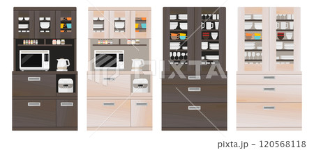 木製食器棚ベクターイラストセット 木目 電子レンジ 電気ケトル 炊飯器 食器 マグカップ 引き出し