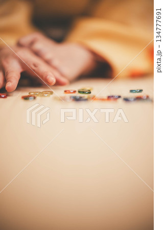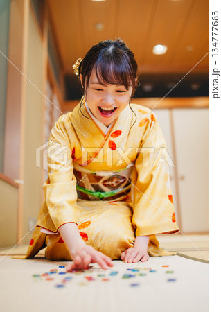 おはじきと若く美しい着物女性