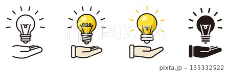 手の上にランプ。電球のアイコン。アイディアやインスピレーション、発見、ひらめき。