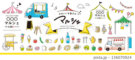 かわいい手書きのマルシェ、フェスティバルの素材セット(フレーム、タイトル、イラスト)/春、夏