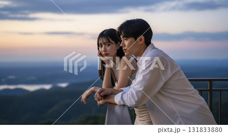 夕暮れのバルコニーでたたずむ若い女性の横顔