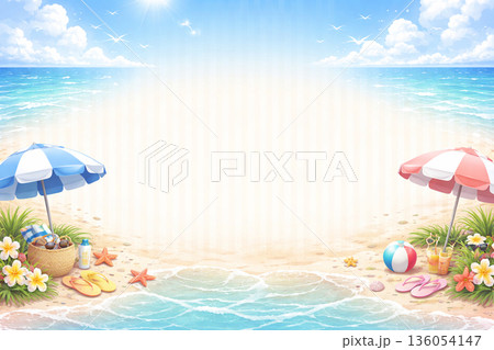 誰もいない砂浜にビーチチェアとパラソルがセットされた風景。トロピカルな雰囲気の夏の楽しい水彩イラスト