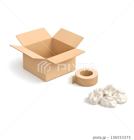 引越し梱包スターターセット 段ボールとテープと緩衝材 3Dイラスト 正方形 俯瞰 白背景 余白