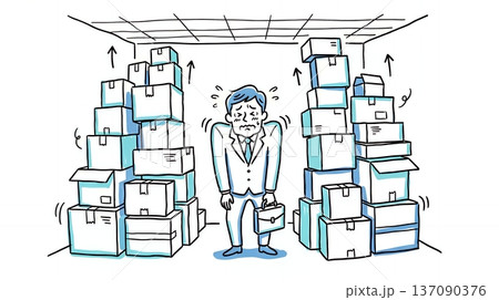 大量の在庫と過剰在庫で倉庫に溢れる商品に悩むビジネスマン