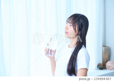 ペットボトルのお水を飲むオフィス街の若いビジネスウーマン