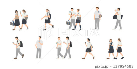 夏の高校生 男女の通学・放課後シーンセット(歩く・スマホ・会話・水分補給)
